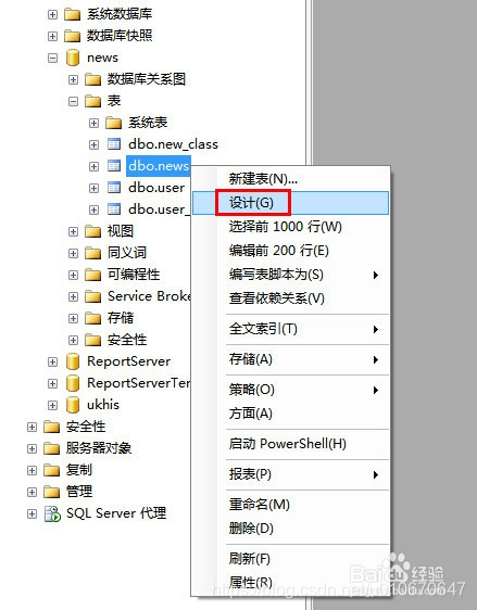 2.在表上单击右键,选择【设计】