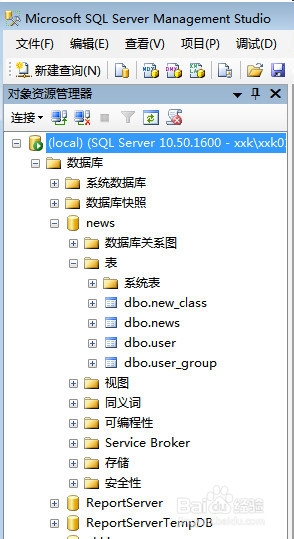 1.Sql Server2008或SSMS菜单,找到数据库“yourdata”(你的数据库名称)展开表文件夹
