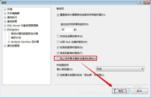 3.取消“阻止保存要求重新创建表的更改”复选框